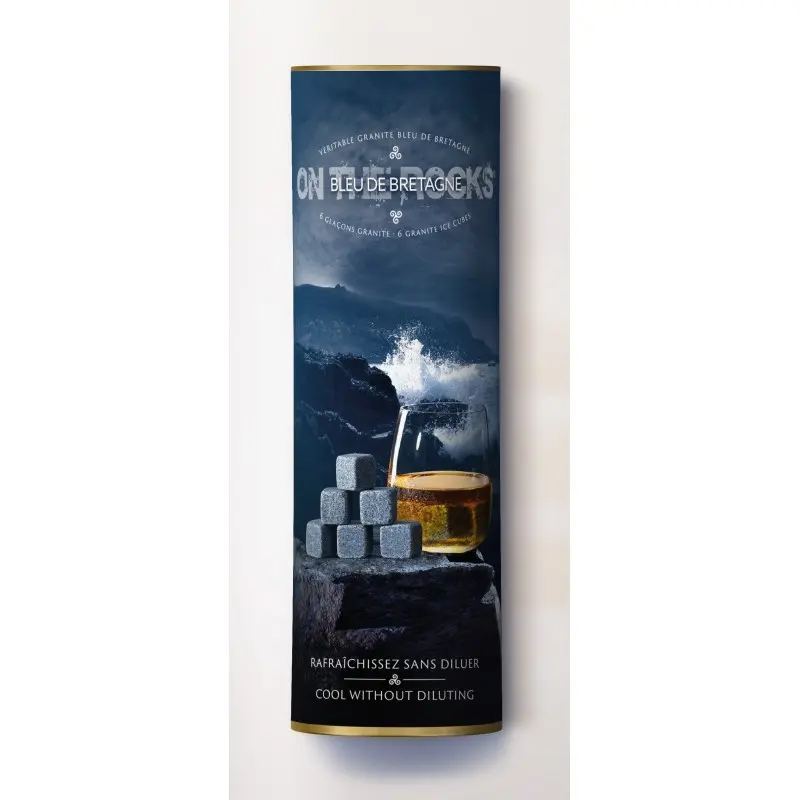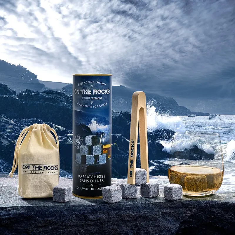 Coffret Cadeau composé de 6 Glaçons en granit Bleu de Bretagne. Placés dans leur sachet en coton naturel et accompagnés de leur pince en bois de hêtre (fabriquée dans le Jura) pour un service soigné.