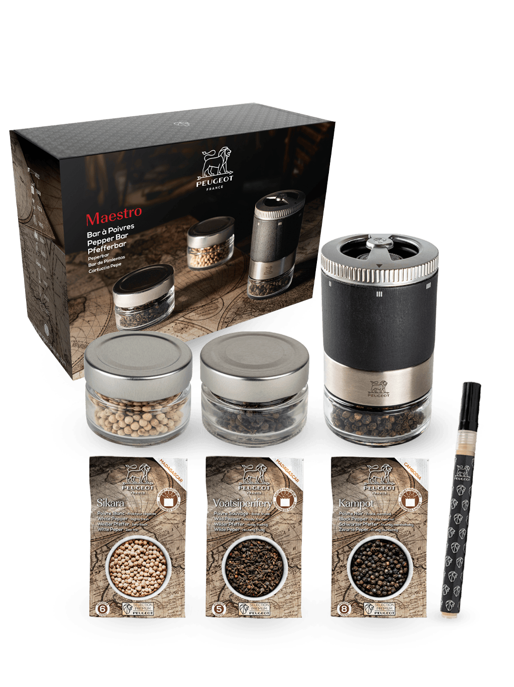 Avec le coffret Maestro, Peugeot propose l’instrument idéal pour partir à la découverte du monde des poivres : un moulin à poivre Made in France doté de réservoirs interchangeables associé à une sélection de 3 grands crus de poivres aux arômes extraordinaires. Maestro invite à une expérience inédite autour des poivres, partagée et centrée sur le goût. Pour exprimer pleinement les arômes du poivre, la taille de la mouture joue un rôle clé. On fera le choix d’une mouture fine pour exprimer la puissance du poivre ou une grosse mouture pour faire ressortir les arômes. C’est pourquoi Peugeot a équipé son moulin Maestro du réglage de mouture u’Select gradué de 1 à 6.