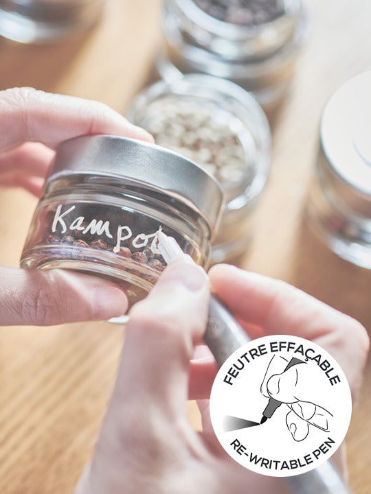 Remplis de vos poivres préférés, ces réservoirs se vissent au moulin Maestro de Peugeot et les poivres qu’ils contiennent peuvent ainsi être moulus tour à tour. Le passage d’un poivre à l’autre est facile, rendant ludique la découverte des arômes des poivres. Pour une expérience parfaite, un feutre effaçable complète le coffret, permettant d’identifier le contenu des réservoirs de poivre. Passer le réservoir au lave-vaisselle pour effacer toute trace de feutre.