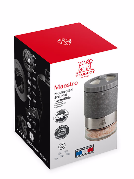Le moulin Maestro sel est la pièce centrale du concept de Bar à Sel. Equipé du mécanisme sel en Zircone, innovation Peugeot, et du système du reglage u’Select, il offre une qualité de mouture inédite, du sel glace au sel croquant.
