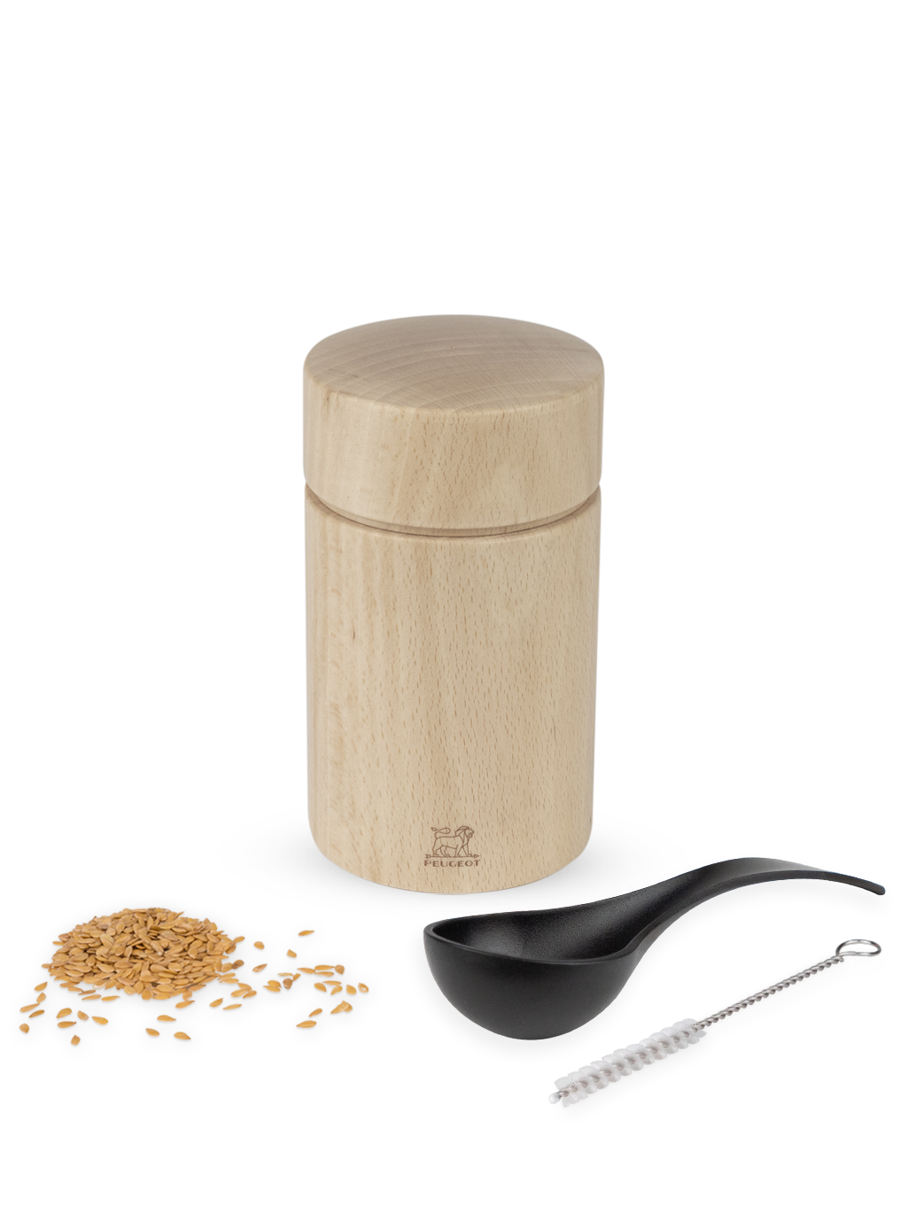 Ainsi, pour profiter pleinement des bienfaits de cette graine, Peugeot propose Naka, un moulin manuel en bois, made in France, dont le mécanisme breveté a été spécialement conçu pour moudre les graines de lin et le sésame puisqu’il s’adapte à leur consistance et à leur dureté. Ce mécanisme, entièrement démontable pour un nettoyage facile et express est garanti pour une durée de 5 ans. Ce moulin en bois au chapeau amovible pour un remplissage minute s’accompagne d’une cuillère doseuse permettant de mesurer l’équivalent de 10 grammes de graines de lin.