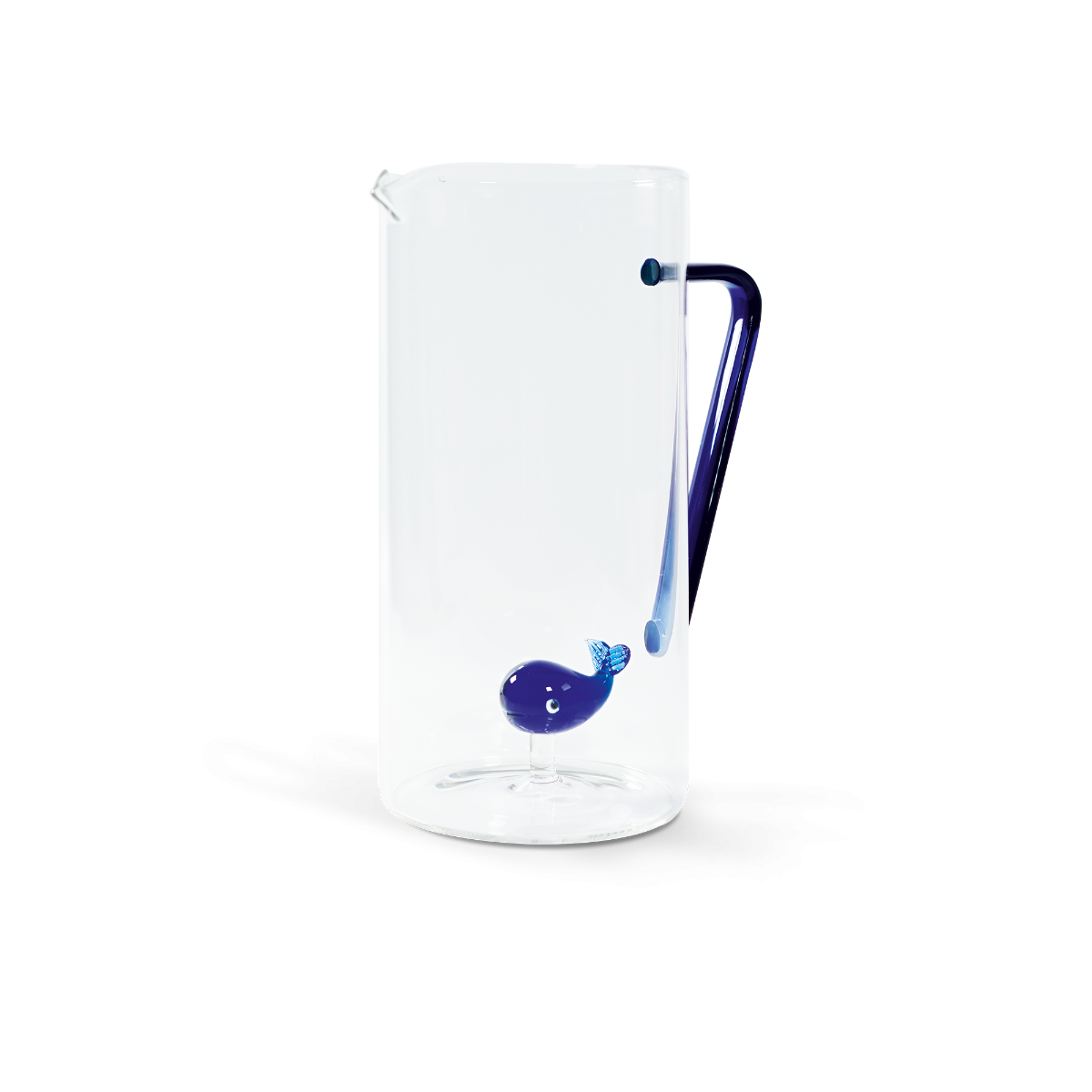 Pichet en verre borosilicate avec figurine en verre à l’intérieur. Chaque sujet est fabriqué à la main en verre soufflé, ce qui fait de chaque carafe une pièce unique.
