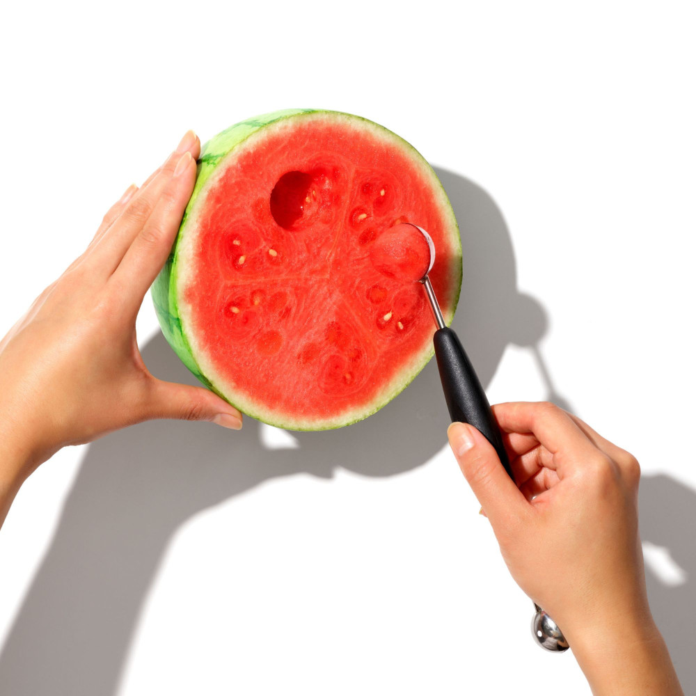 Pour créer de jolies billes rondes et régulières de fruits frais, idéal pour préparer vos salades de fruits, et toutes autres pâtisseries gourmandes… Son double embout offre ainsi 2 tailles de billes différentes : ø2,5 cm et ø3,2 cm. En acier inoxydable, le rebord est conçu pour pénétrer franchement dans le fruit, mais sans être coupant et donc risquer de se couper. Son manche en Santoprène est caractéristique des meilleurs produits OXO, il est antidérapant donc pratique pour travailler avec les mains humides et très ergonomique pour un confort maximal même avec des gestes très répétitifs. Les petits coussins sur les côtés du manche absorbent la pression pendant l’utilisation, très utile quand on a des problèmes de préhension.