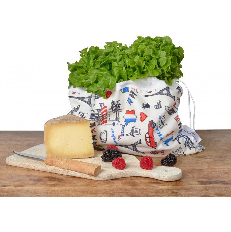 Placer les fromages achetés à la coupe de type Parmesan, Conté, Cantal… et les jambons secs achetés à la coupe de type Bayonne, Coppa, Parme… avec leur papier glacé de la coupe, dans le Sacasalades. Resserrer le lien coulissant et placer le Sacasalades dans le réfrigérateur.