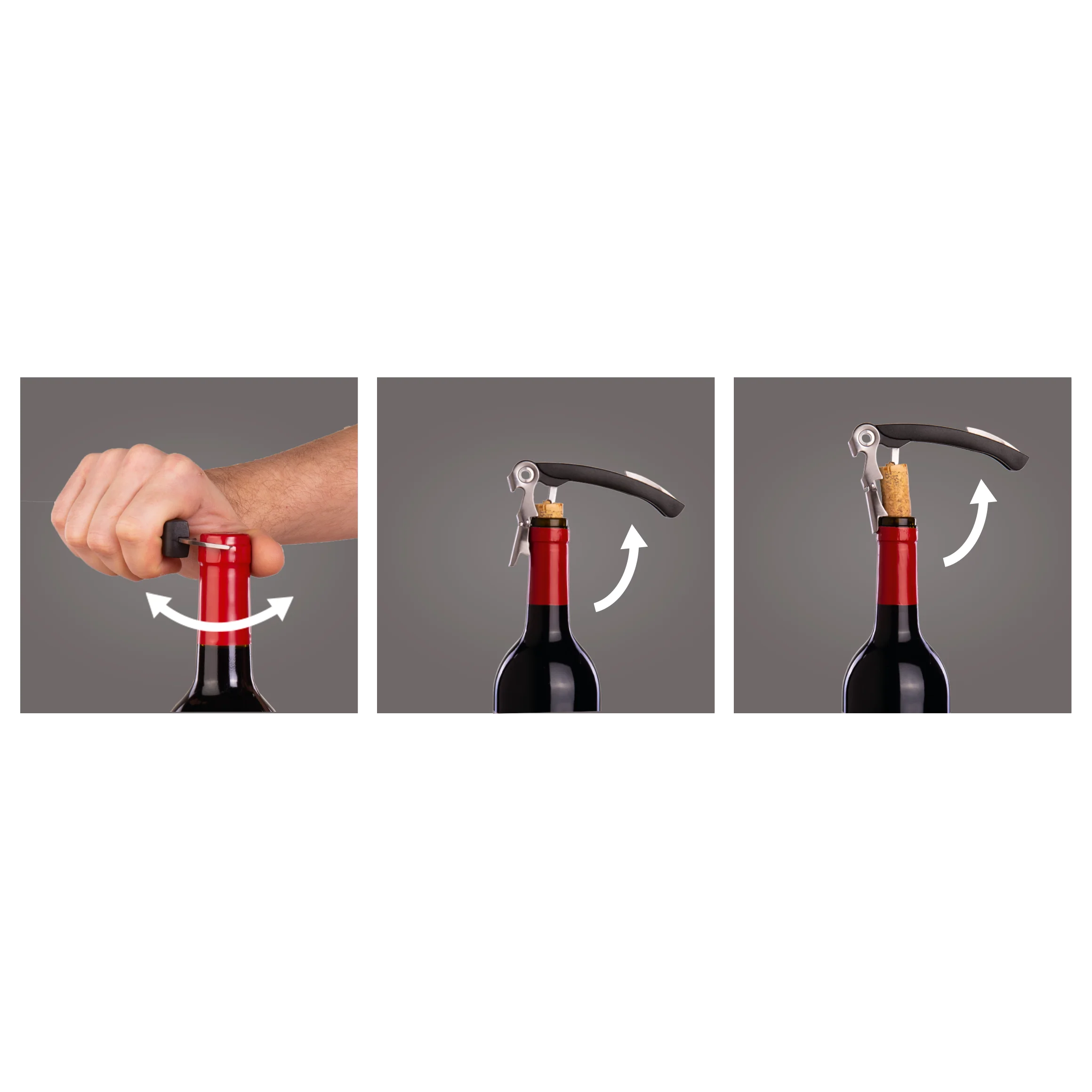 Placez le tire-bouchon sur le bouchon, tirez en deux étapes simples pour obtenir un levier optimal et retirer le bouchon sans effort. Utilisez le coupe-capsule pour découper proprement la feuille, puis le décapsuleur pour ouvrir facilement les bouteilles à capsule.