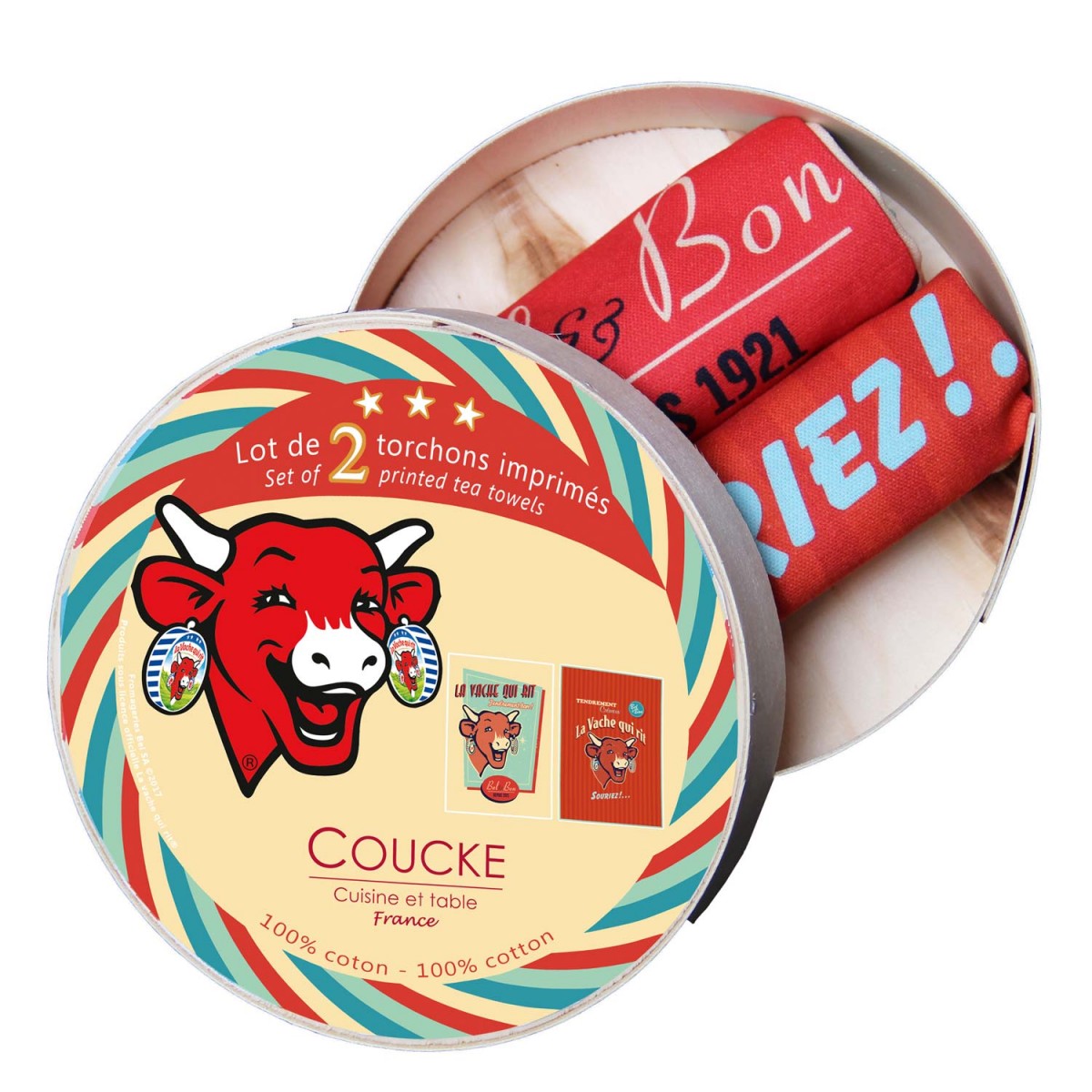 Ce lot de deux torchons 100% coton imprimé reprennent les codes rétro des anciennes publicité La Vache Qui Rit, avec l’ancien logo et les anciennes couleurs vintage. COMPOSITION :