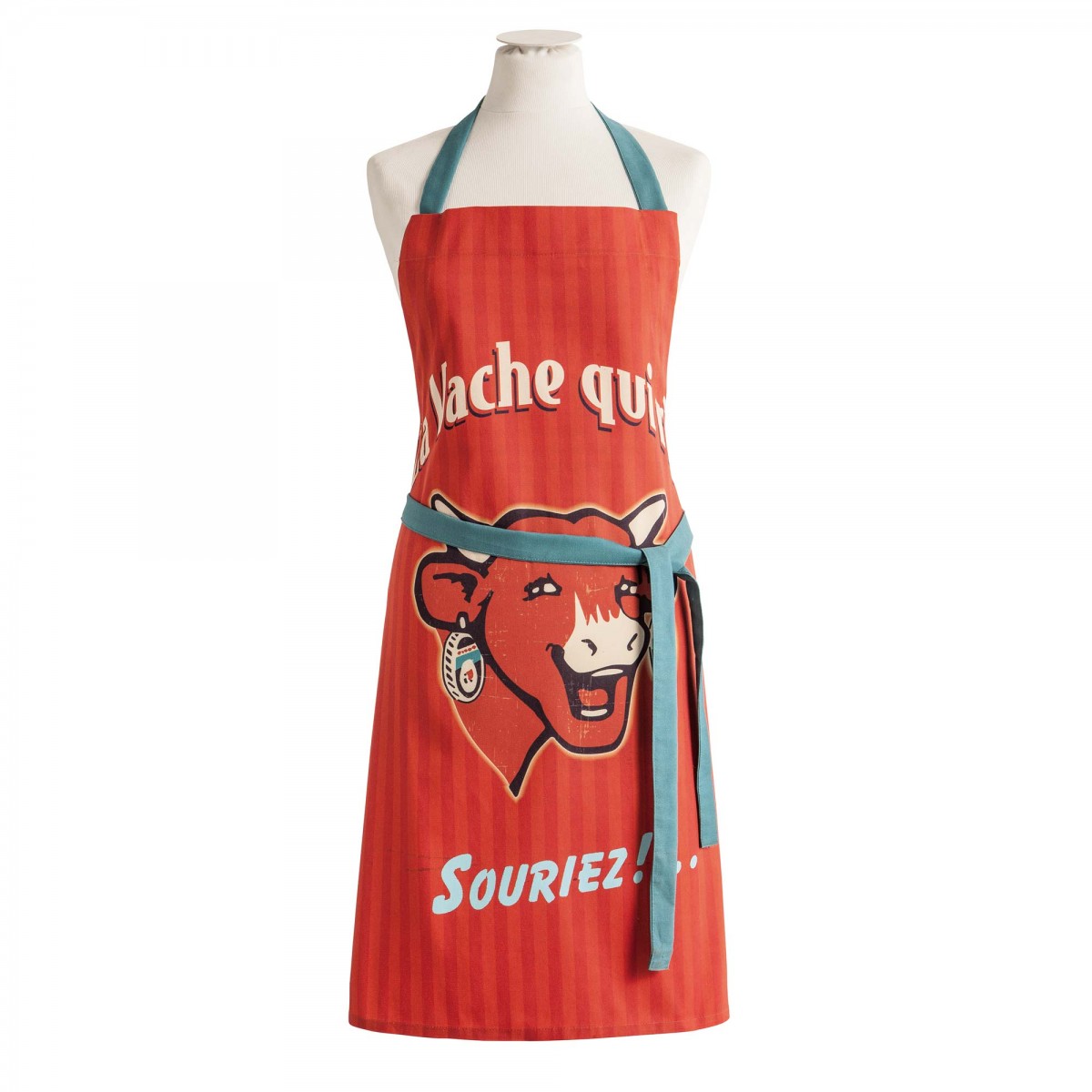 Tablier 100% coton coloris rouge. Le tablier est orné de la célébre vache qui rit imprimée sur un fond rétro rouge à rayure. Il est ajustable au cou et à la taille. COMPOSITION :