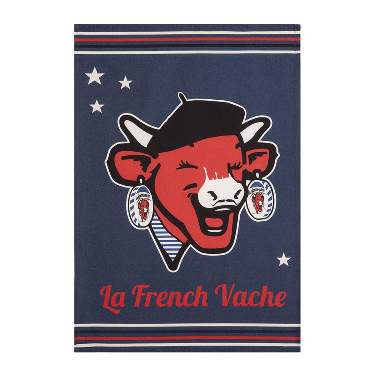 Le torchon est orné de la célèbre Vache Qui Rit imprimée sur fond bleu marine.