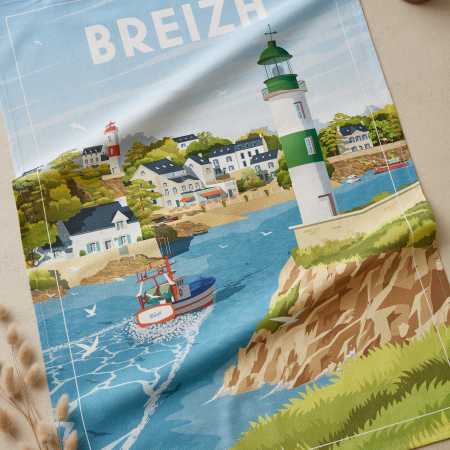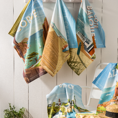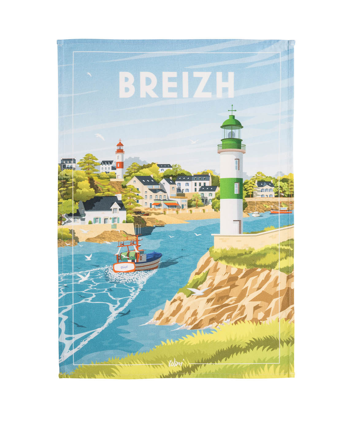Ce torchon imprimé, qui rappelle une affiche, est un produit du catalogue de la marque nordiste Wim’. Avec son style vintage, mais pas trop, ce motif revigorant nous transporte immédiatement sur les magnifiques côtes bretonnes.